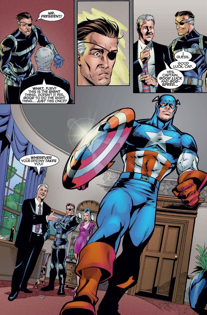 Cap basically dares Nick and Val to stop him, and then blackmails them into leaving him alone to rediscover America. (Is it just me or does he look with John Walker in the second panel below?) To add insult to Nick’s injury, President Clinton gives Cap his full support, cementing it with a salute, which Cap returns.