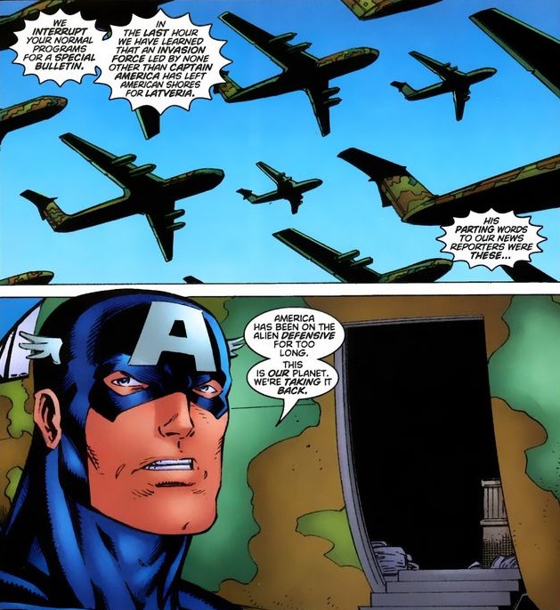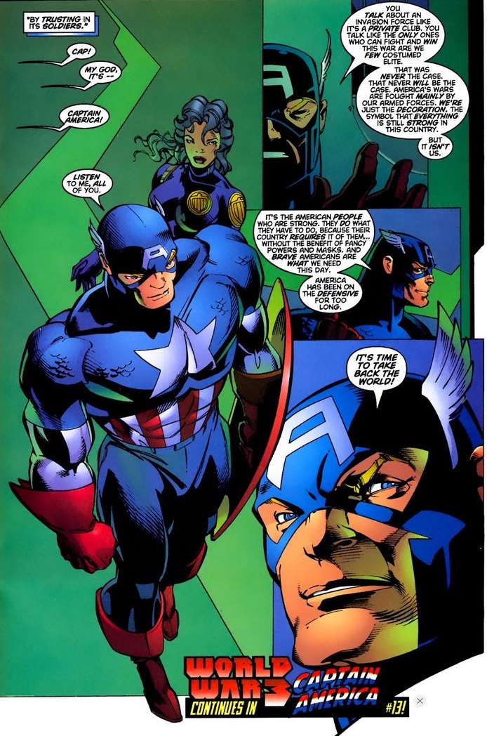 Cap suits up and rejoins the rest of the heroes, giving a speech about the limited role of superheroes alongside the military in domestic battles (such as the one coming in the next issue against Latveria), echoing his traditional position about his own role alongside the U.S. military in war.
