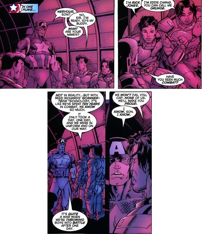 Cap doesn’t appear until issue #3, when he and a number of his colleagues confront a “bug-boy,” as Johnny calls him, who found his way into the Heroes Reborn universe during a fight between the Hulks of Two Worlds, and believed, as everyone in his world did, that the lost heroes were dead.