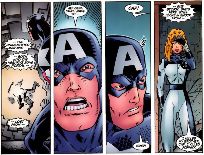 Most of the rest of the issue is fight fight fight, and after Cap’s temporary partner Deathblow disappears in the Negative Zone with their Daemonite enemy, he turns to see another familiar face making an unbelievable confession…