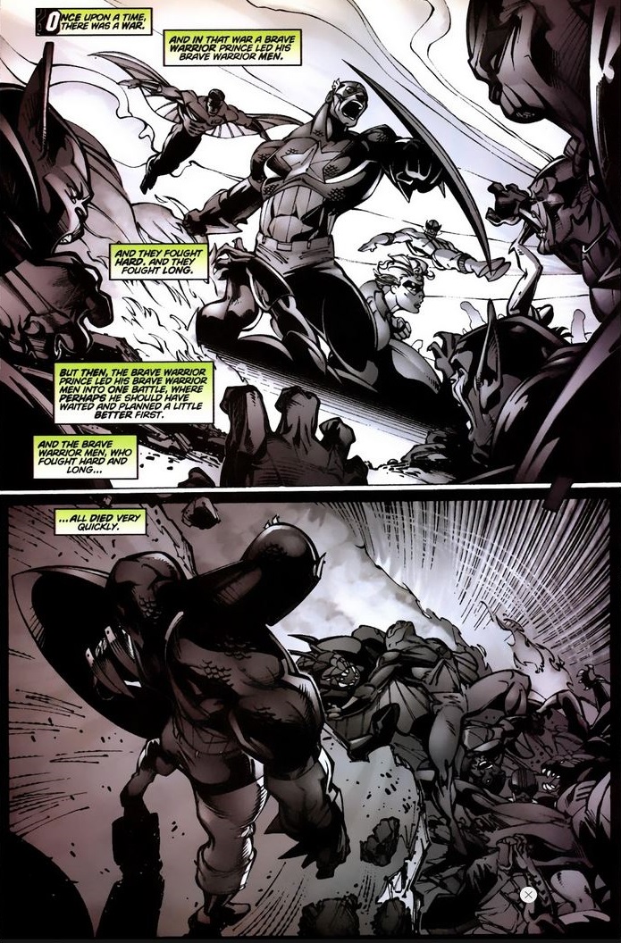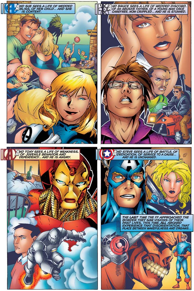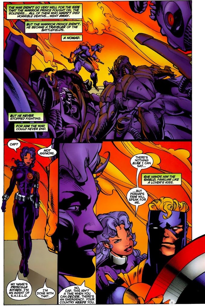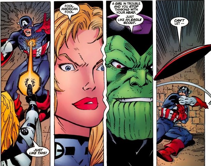 The gist of “World War III” is that the heroes of the merged universe are fighting against Doctor Doom, the Skrulls, and the Daemonites, and once Reed Richards discovers the nature of their reality, he decides the solution to all their problems is to separate the universes. While there is a Captain America serving on the Avengers in this reality, he is actually the Wildstorm character Spartan, and the real Cap… well, in this reality he has been through another war, which did not go well.