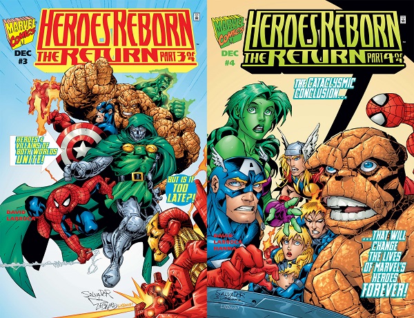 Heroes Reborn: The Return #3 (December 1997): Peter David (writer), Salvador Larroca (pencils), Art Thibert, Bud Larosa, Andew Pepoy, and Mark Prudeaux (inks), Steve Buccellato and Mad Science Media (colors), Richard Starkings and Comicraft (letters). (More details at Marvel Database.)