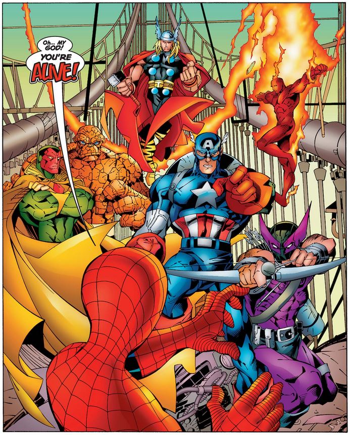 Despite some last-minute treachery on the part of Doom, which keeps him and Thor in the Heroes Reborn universe a little longer, the rest make it back to the 616, at which point the memories of their original lives rush back. Some are happier, some are despondent, but Cap sees little difference, given the tightly circumscribed nature of his life and mission. (Different world, same job.)