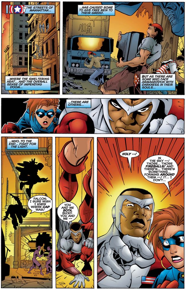 While most of the heroes (and Doctor Doom) are realizing the nature of this world and discussing escape plans with Ashema and Franklin, some are still out there fighting crime, including the Falcon and Rikki “Bucky” Barnes.