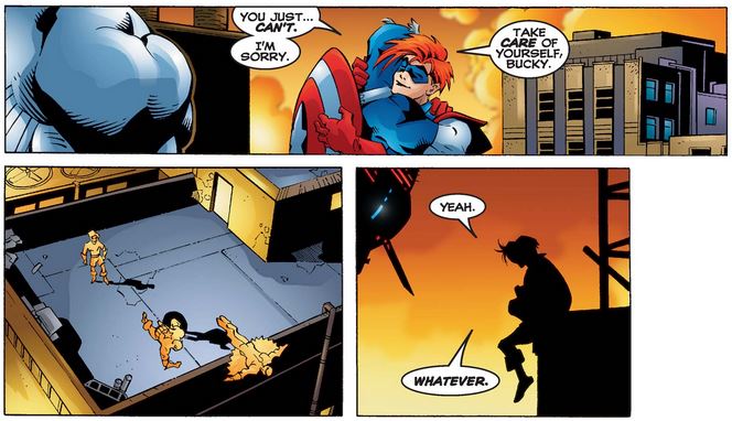 From Heroes Reborn: The Return we head into the “Heroes Return” era, in which the four titles are relaunched again into third volumes with new #1s. (And one more: Thor eventually makes it back to the 616 universe in time his first #1 issue.) And what of Rikki “Bucky” Barnes? She appears in Heroes Reborn: Young Allies, one of a collection of one-shots exploring the aftermath of the heroes’ departure from the Heroes Reborn world, before eventually finding her way into the 616 universe, where she is reunited with her mentor (which we will see eventually) and even becomes Nomad for a time. (But who hasn’t?)