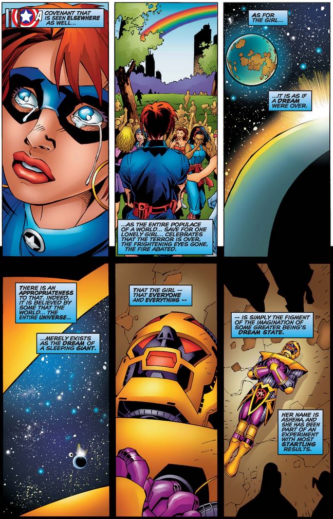 As for young Rikki, she mourns the loss of her world’s heroes, but she lives on, if only in the dreams of Ashema, who came to appreciate humanity and agreed to house Franklin’s universe in her dreaming consciousness for all time, with her fellow Celestials learning more about humanity through her.