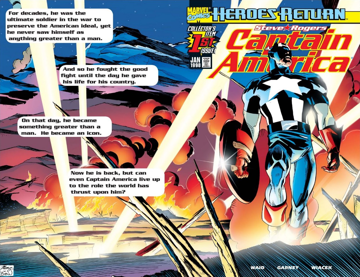 Captain America (vol. 3) #1, January 1998: Mark Waid (writer), Ron Garney (pencils), Bob Wiacek (inks), Joe Rosas and Digital Chameleon (colors), John Costanza (letters). (More details at Marvel Database.)