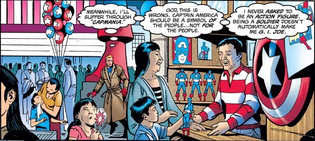 We are also introduced to an ongoing element of the first part of this new run: “Capmania,” in which our hero finds himself a pop culture phenomenon, a status quo with which he is very uncomfortable.