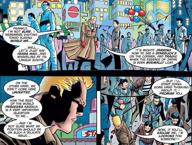 When a reporter sees this random American walking around, he asks him what he thinks about the Westernization controversy. Cap explains that he can see points on both sides, acknowledging the regret over the disappearance of traditional culture while at the same time recognizing that free choices of individuals contributed to it, and also expressing concern about the impact this has on America itself.