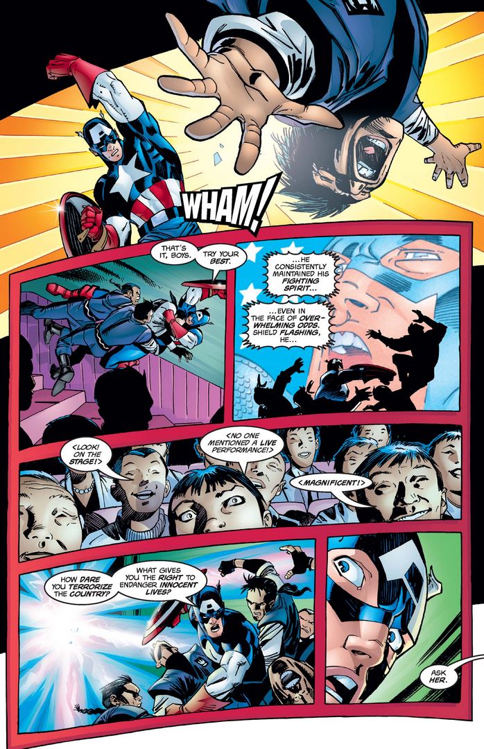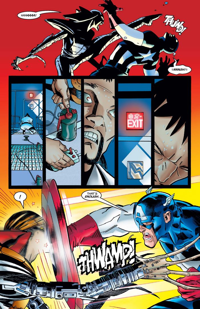 …and Cap must clarify yet again that he opposes their methods, not necessarily their message. Lady Deathstrike trots out the old chestnut “the ends justify the means,” to which Cap does not even bother to respond. (“Whatever, Tony.” “Who’s Tony?”)