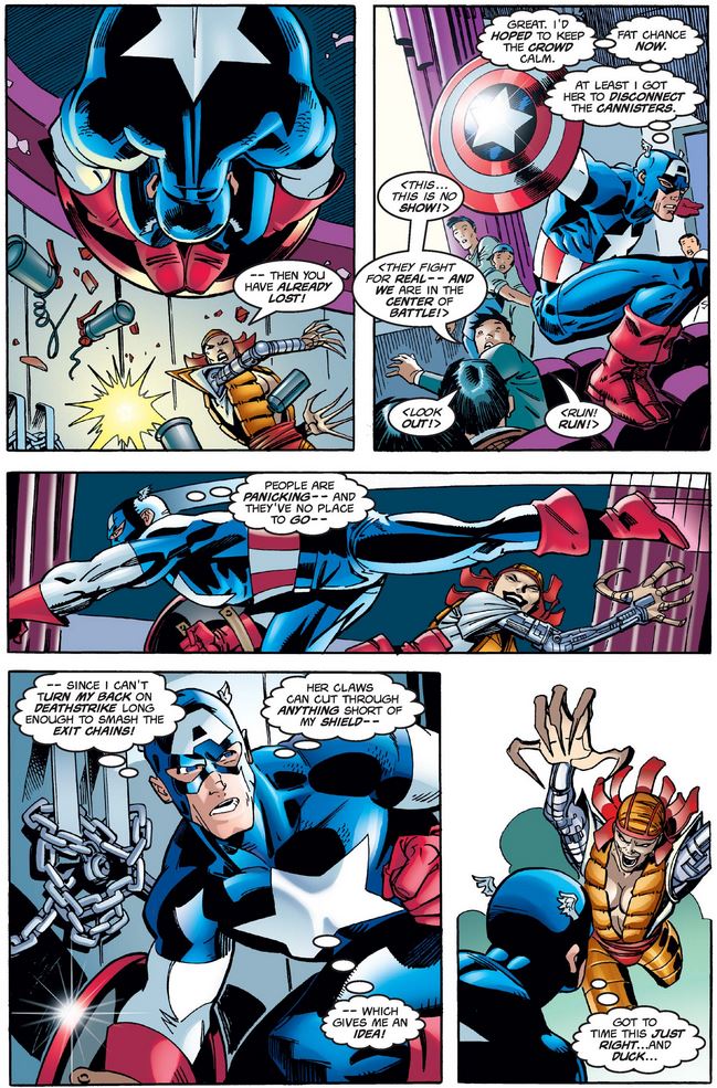 Cap makes sure Lady Deathstrike stays down for the time being, although she does manage to taunt him after her top man threatens to trigger the nerve gas and kill everyone in the theater.
