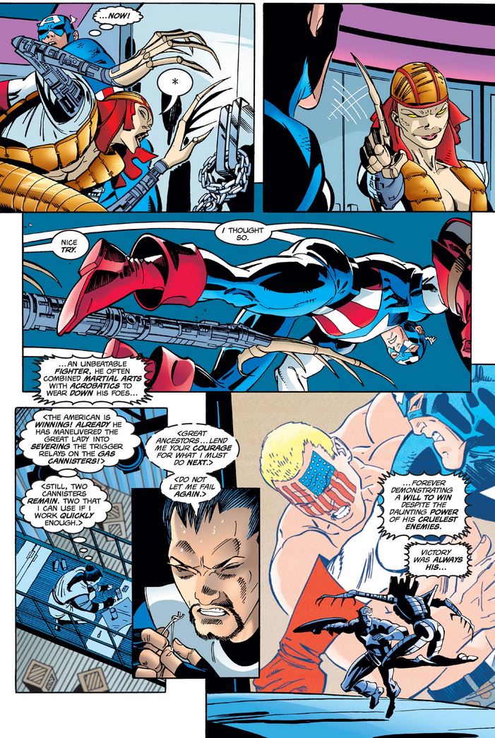 While he fights Lady Deathstroke, Cap is also concerned with crowd control and disabling the nerve gas, and he cleverly sees a way to use one problem against another.