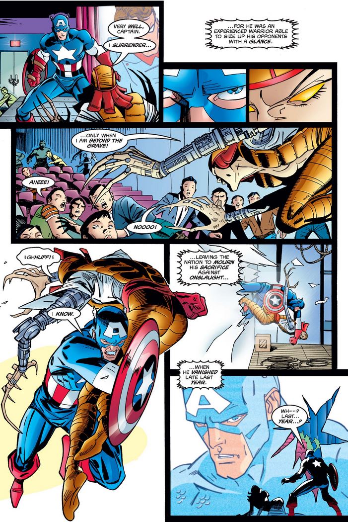 …but leaves Cap just as clueless as before (and likely feeling a little mocked). Taking a moment to look around, he sympathizes with the terrorists’ concern (but not their actions) before tracing his last memory, the fight with Onslaught that led to… well, you know.