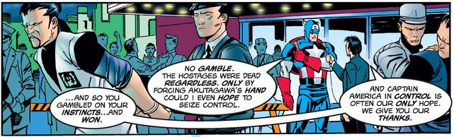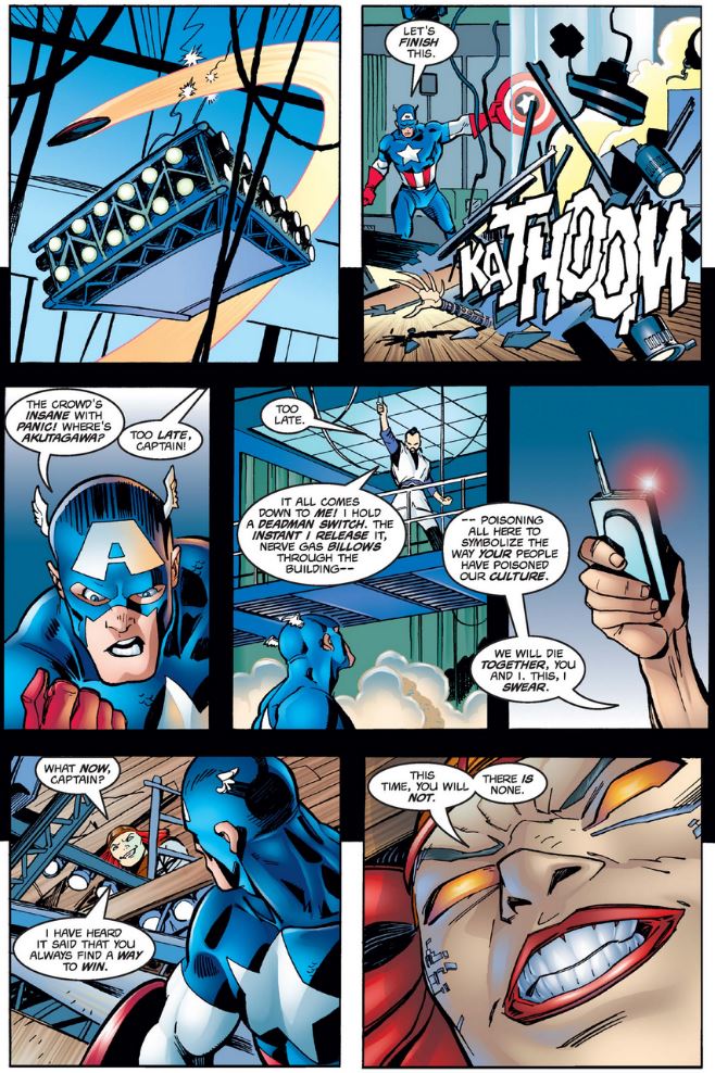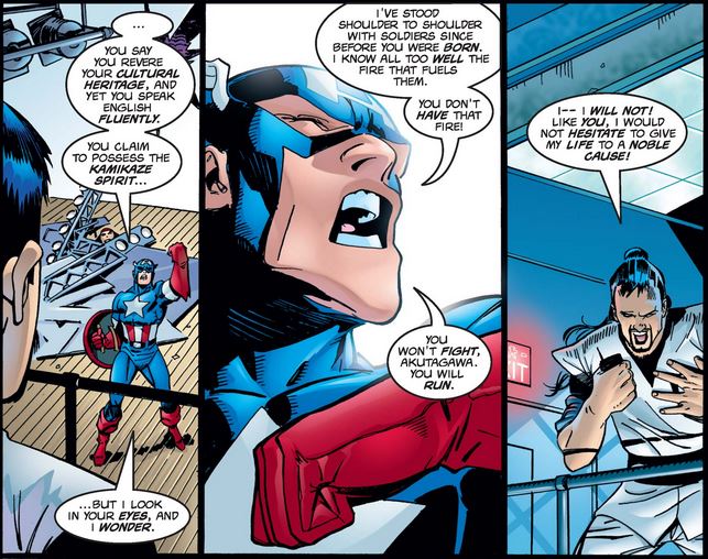 When the head terrorist, Akutagawa, speaks of standing up for the honor of the nation and his willingness to die for it, Cap engages in some taunting of his own, accusing Akutagawa of lacking the fortitude and dedication he claims…