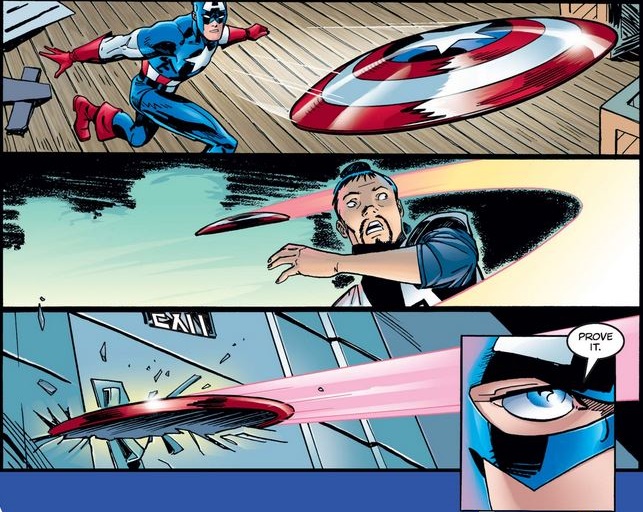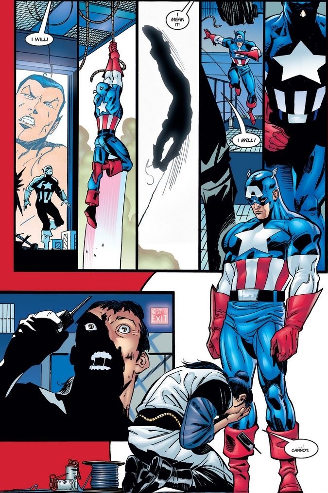 While Cap chases the terrorist, we get a double-page montage of his origins, re-establishing the classic canon to erase the memory of his brief “Heroes Reborn” life.