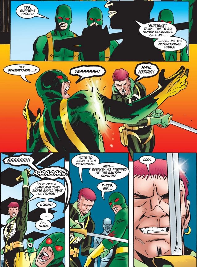 Let’s take a peek at the new Hydra Supreme—make that the Sensational Hydra—just because (a) he looks like Guy Gardner and (b) he gets a good laugh out of Hydra’s catchphrase.