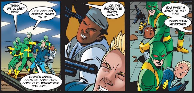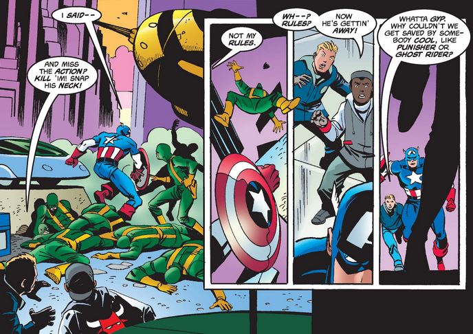 Cap tells the boys to run while he fights a group of Hydra agents, but do they listen? To make matters worse, they encourage him to kill his enemies, and when he asserts that he does not do that, they wish somebody “cooler” had come to their aid, recalling the comics fan from Captain America #425. (Thanks to Chris for reminding me what issue this was from!)