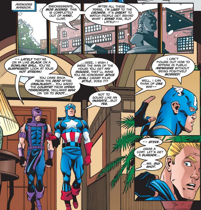 After Capman and Robin Hood return to Stark Manor, they pick up their discussion of Capmania, with Clint starting out sympathetic before turning jealous—and then suggesting an obvious way for Cap to mingle with the people unnoticed. (And it doesn’t involve an overcoat.)