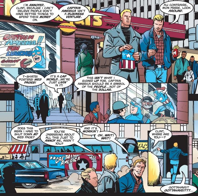 If he’s embarrassed by the action figures, Cap expresses confusion, if not disappointment, at the people buying the Cap merch (and lunch deals) as well as the business making money off his image. And Clint is just along for the ride, always looking for a way to poke the old man when he can (but not harshly or meanly, at least not any more).