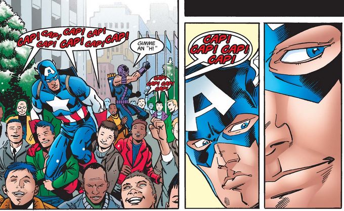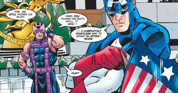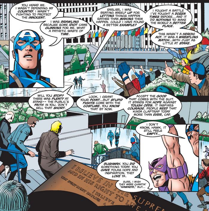 As he explains, the fight with Batroc didn’t do any good, and distracted him from pursuing actual wrongdoers and keeping innocent people safe. Clint says sure, but it wasn’t all for nothing: Cap did give the public someone to cheer for (although, given Capmania, this may not have been necessary). More important, he may have inspired them to do something heroic in their own lives. (After all, as far as they knew, Batroc was an actual threat that Cap put down.)