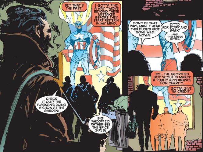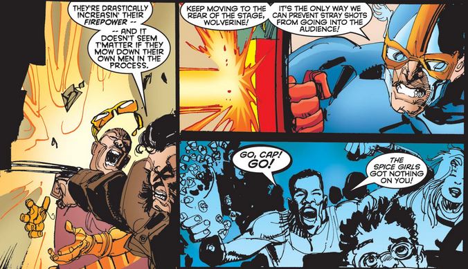 After Logan ruminates about some of the aforementioned recent turmoil in his life, he sees a poster for a charity event featuring the Sentinel of Liberty—whom at least one bystander wishes was actually Star-Spangled Spice.