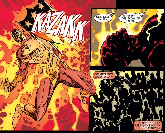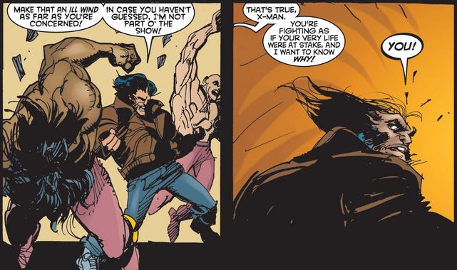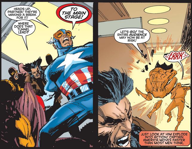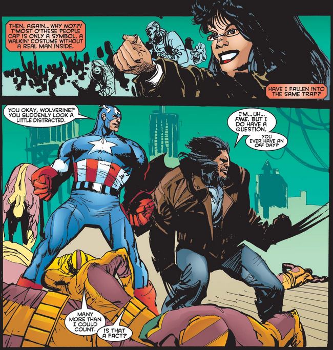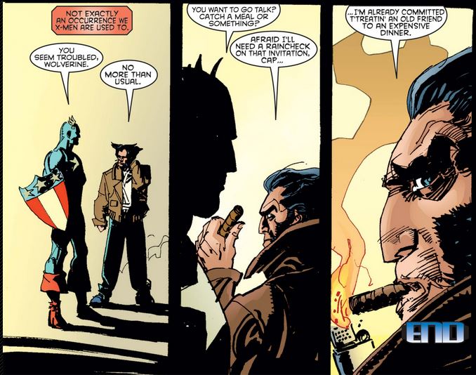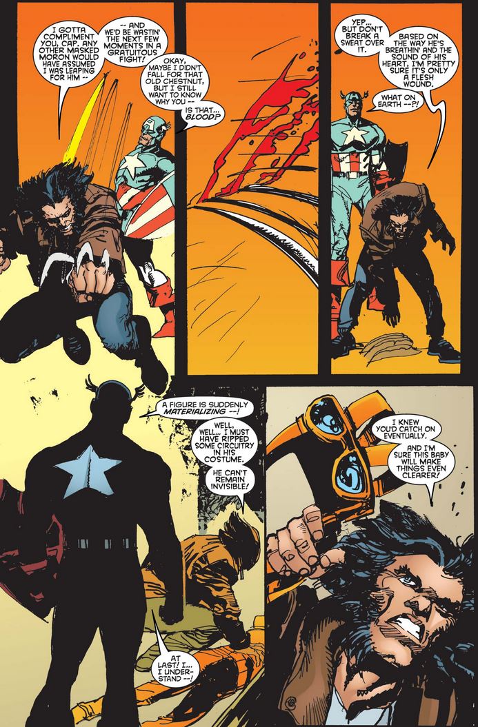 Logan continues to admire Cap, this time for his perseverance and stamina—albeit forgetting about his super-soldier serum and Vita-Rays, which would later be revealed to be a predecessor of the Weapon X treatment that Logan underwent himself.