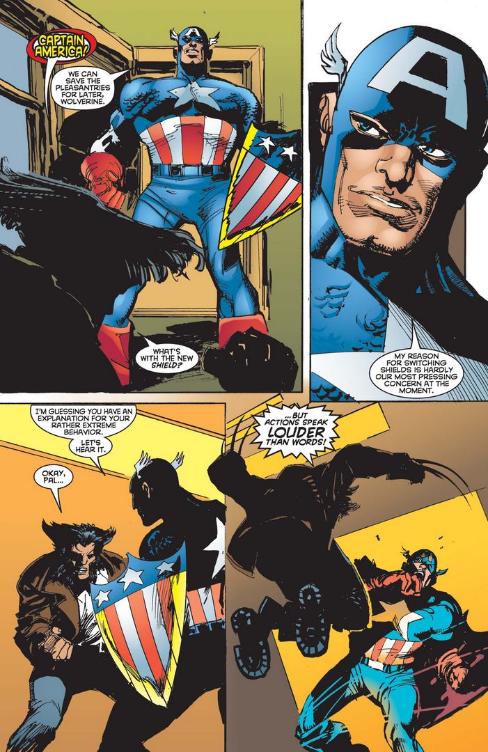 Cap apparently considers his mere name, as well as questions about his new shield, to be unnecessary small talk, and demands to know why his friend is acting so erratically. Logan appears to lunge toward our hero, surprising him at first…