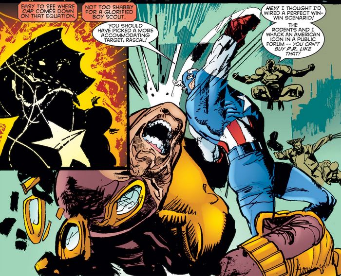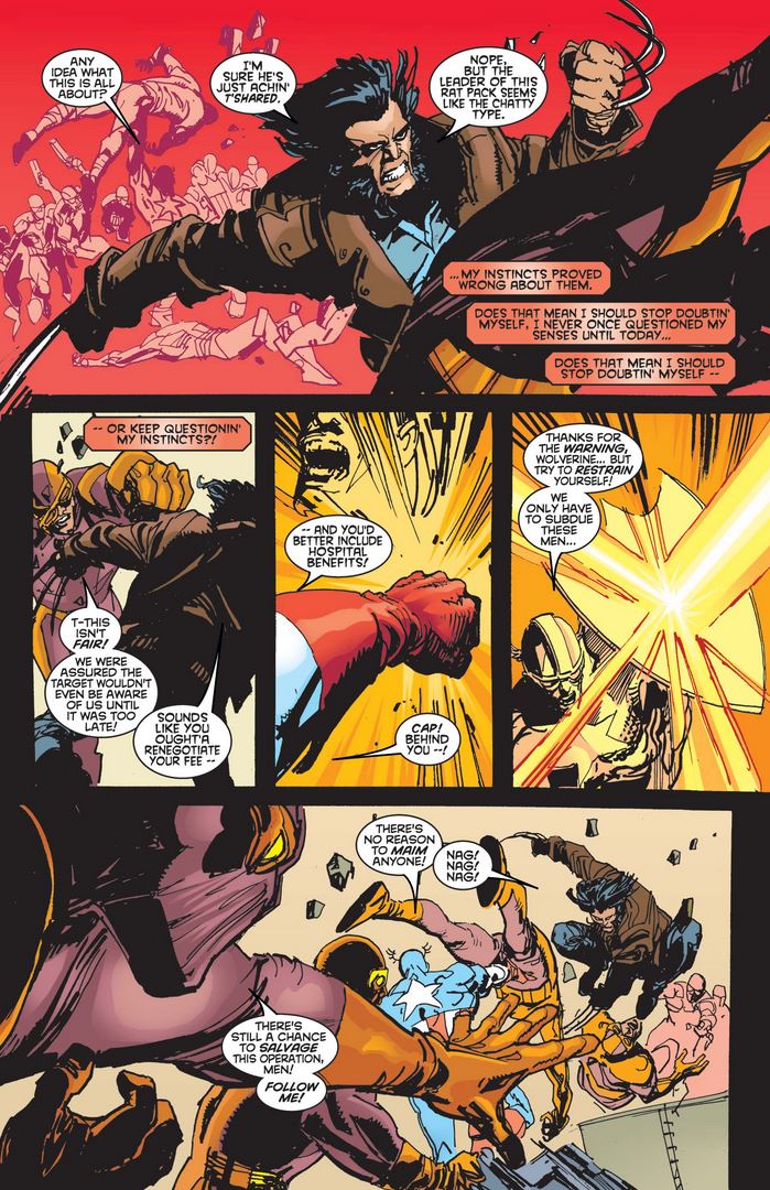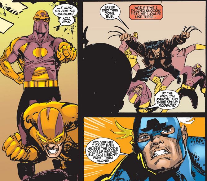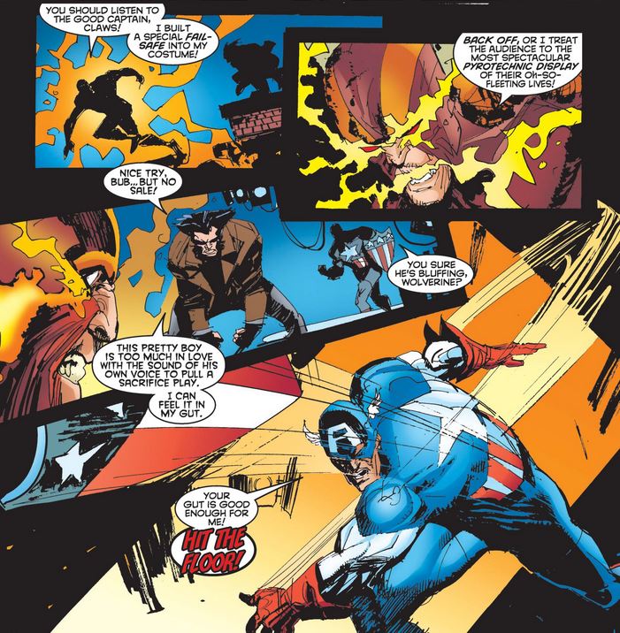 Rascal tries to same “I’ll kill myself and take all a’ youse wit’ me” gambit that the Japanese terrorist did recently in Captain America #1, but this time Logan is the one to call his bluff, and Cap trusts him.