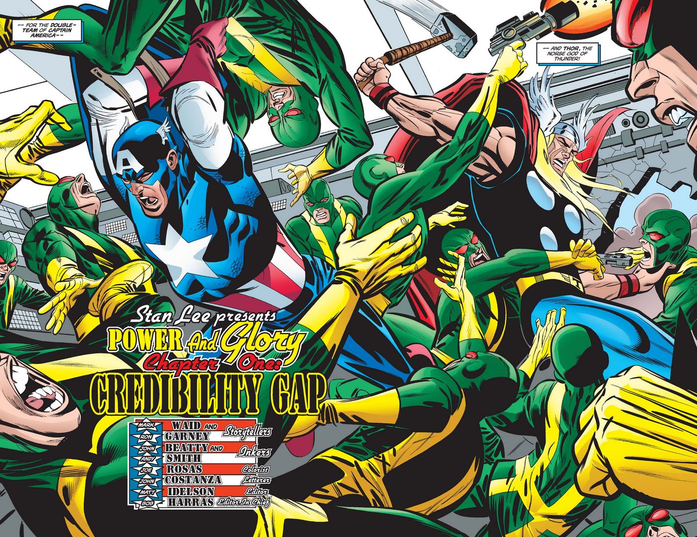 We start our coverage of the issue with this double-page spread of Cap and Thor taking a Hydra cell in London apart.