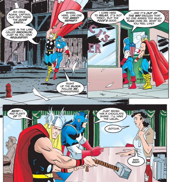 After his Uber drops him in Brooklyn, Cap takes him to a local diner where he won’t be swarmed by adoring crowds—although Thor finds the beverage selection lacking.