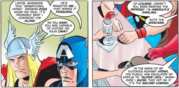 …and then goes to explain the valid reasons the people have for admiring Cap and how that reflects his character and service. Thor says he should appreciate that, but Cap is afraid of that turning into arrogance (reflecting the difficulty of finding the “golden mean” with regard to humility).