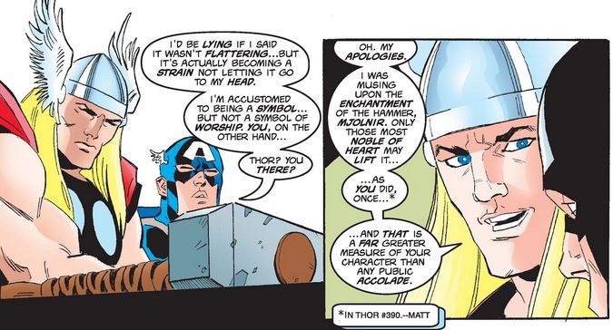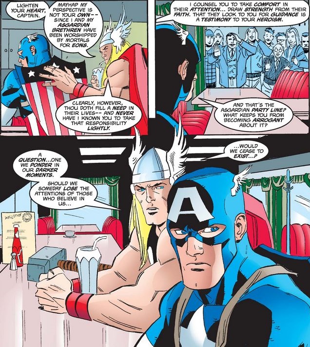 …and admits that, as much as he disapproves, a little bit of him likes it, and then asks Thor his thoughts on being an object of worship. Thor reminds Cap of his proudest moment, which should mean more than the love of the crowd…