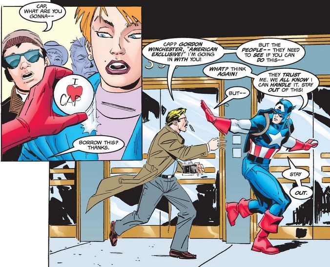 …grabbing an “I♥CAP” pin off a woman’s lapel before shooing a pesky reporter named Gordon WInchester (who reminds me of Harris Hobbs, a notorious pest to Thor in his early years).