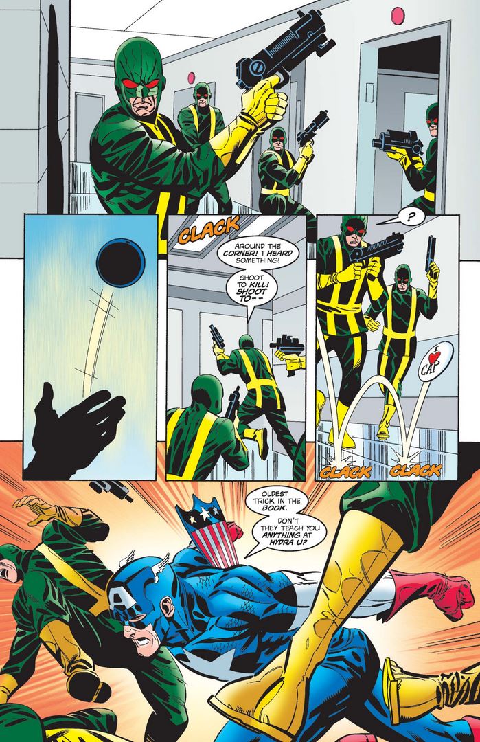 While Thor finally realizes what the famous catchphrase means, Cap affirms his new mission as of issue #3 to root out Hydra cells everywhere (rather than simply reacting to their attacks).