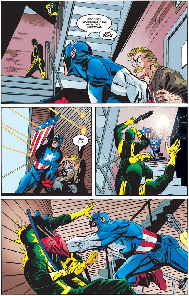 Captain America (vol. 3) #5, May 1998: Mark Waid (writer), Ron Garney (pencils), John Beatty and Andy Smith (inks), Joe Rosas (colors), John Costanza (letters). (More details at Marvel Database.)