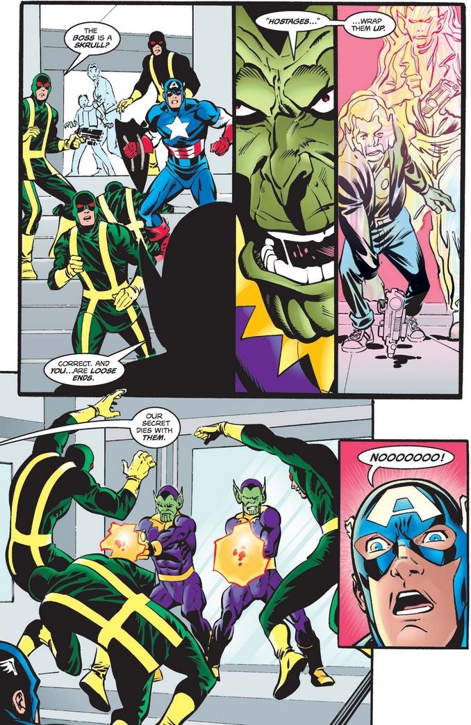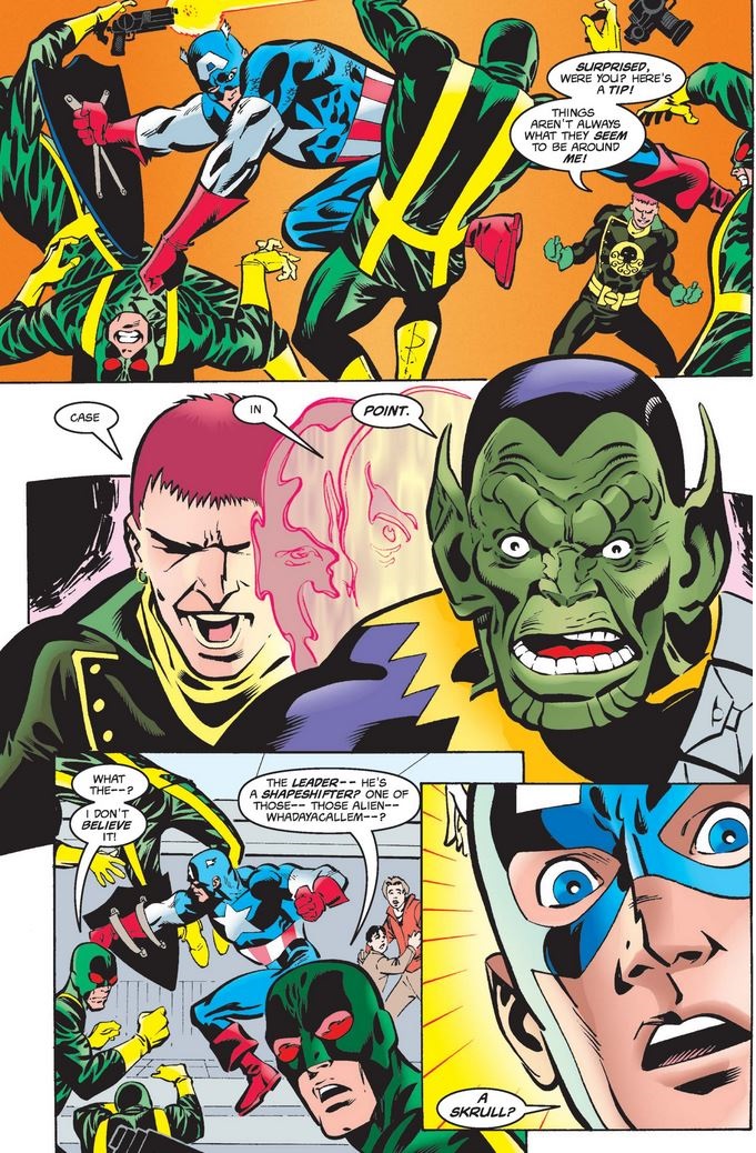 Maybe it’s a just my mind running wild given the connection between the Skrulls and the Fantastic Four, but Cap’s face above looks to me like it could have been drawn by Mike Wieringo, who would later work on an amazing run on FF with Mark Waid before passing tragically young at the age of 44.