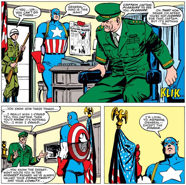 Our first look at “Skrull-Cap” strikes me as a callback to Daredevil #233, especially this scene (where he says he’s loyal to nothing except the dream).