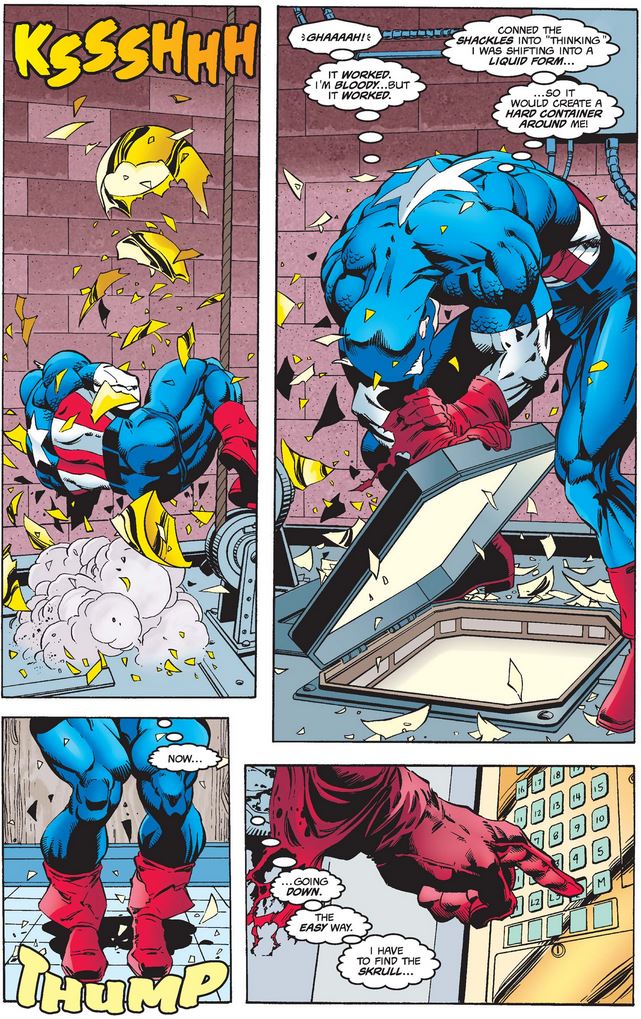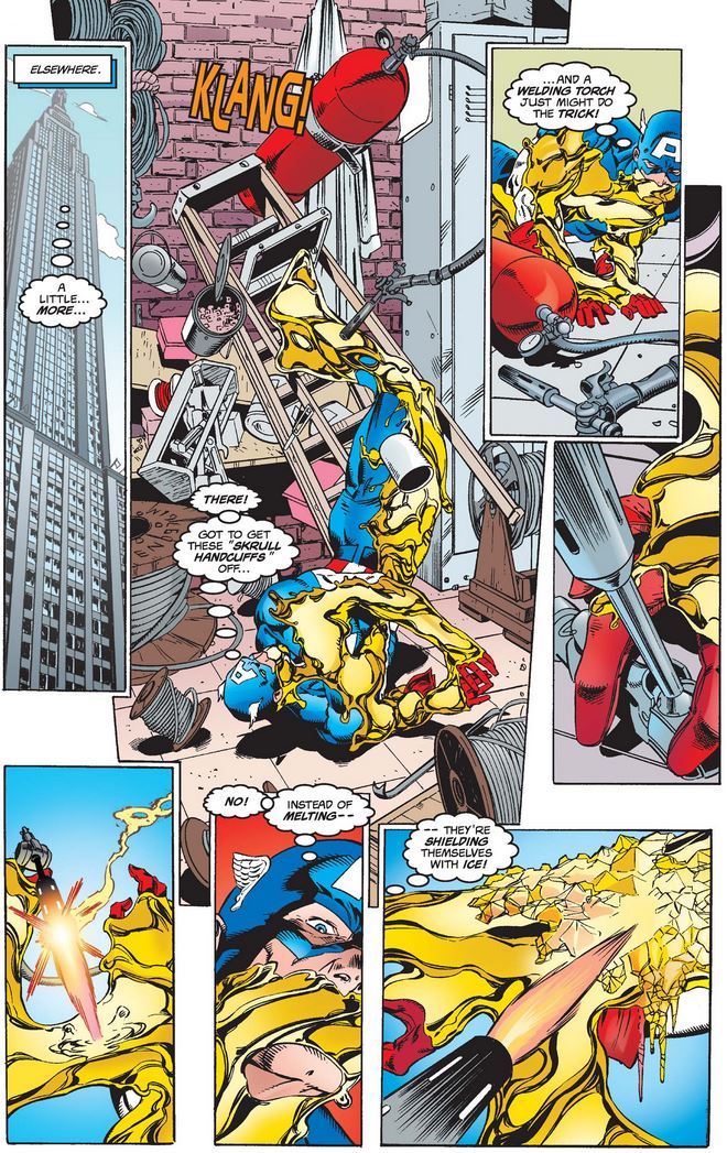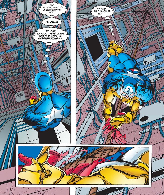 Speaking of Cap, he’s still trying to escape his Skrull bindings, and I agree when he thinks that this idea is desperate.