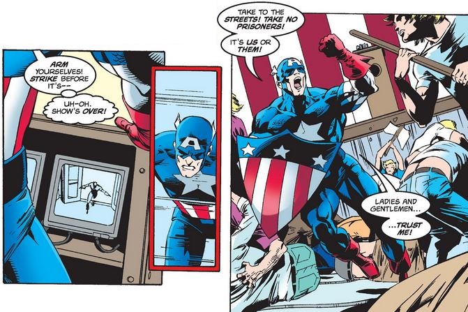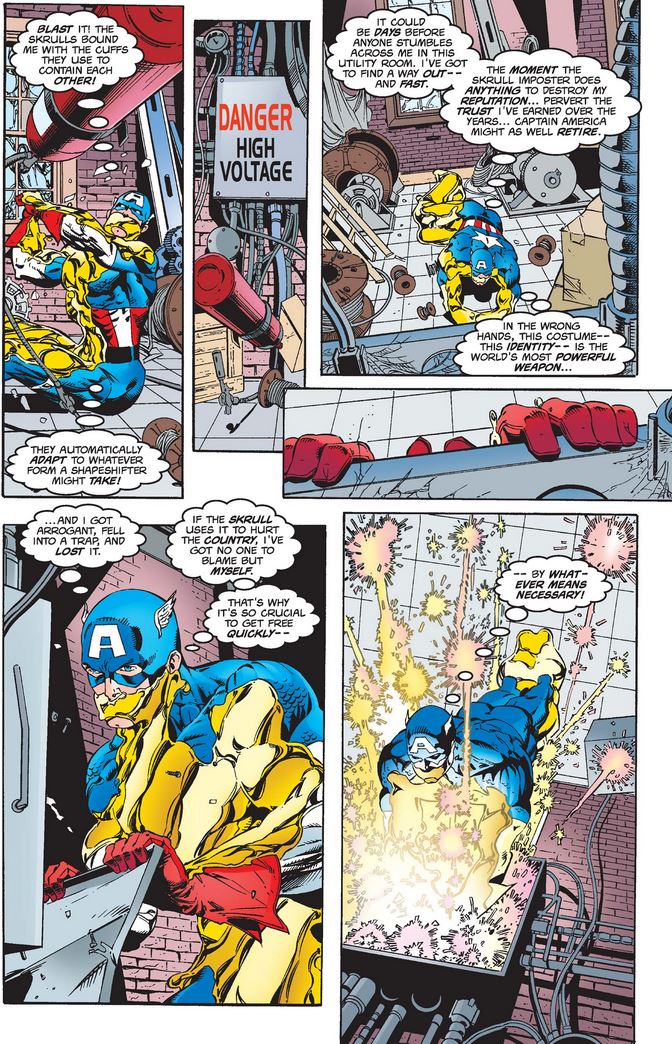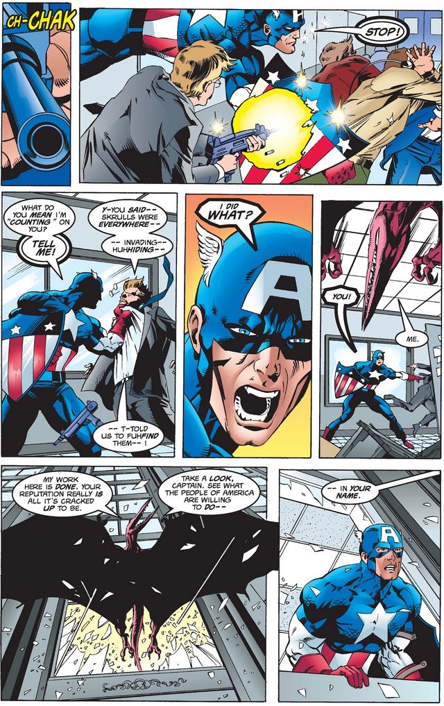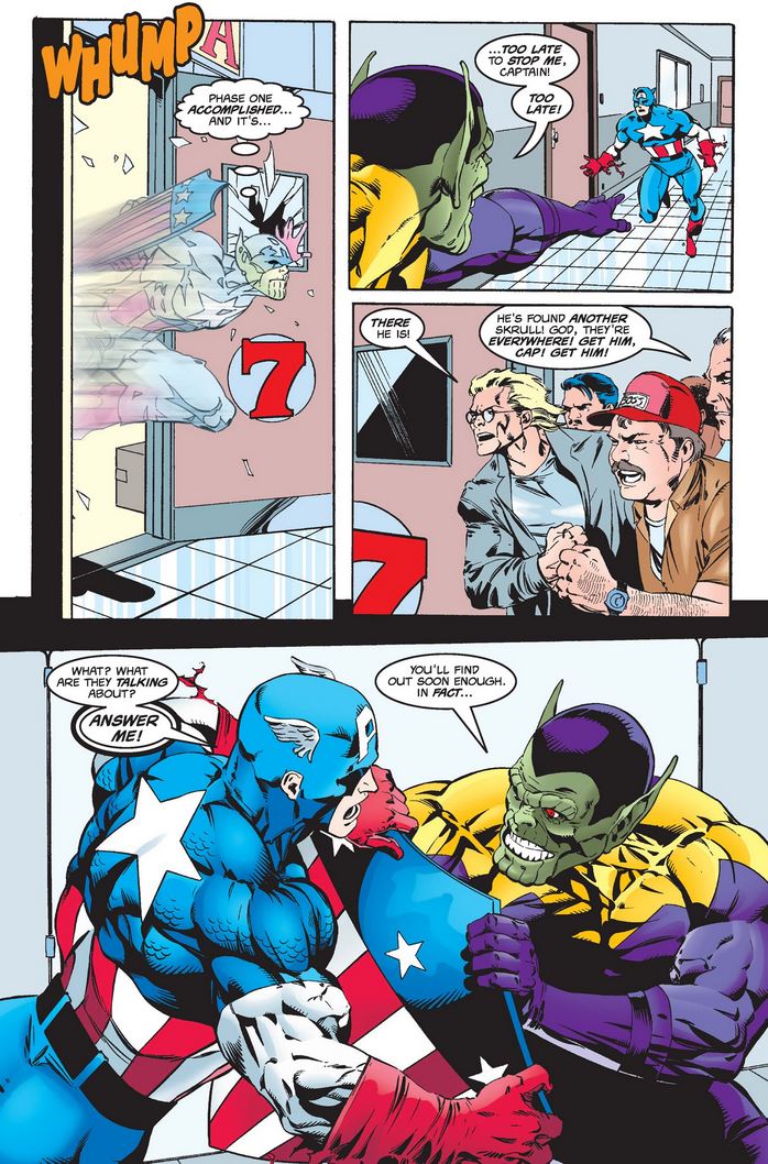 When a bystander takes up arms against the Skrull, others try to stop him, leading him to suspect they’re Skrulls as well, and Cap is forced to intervene—at which point he learns what the Skrull did while co-opting his identity.