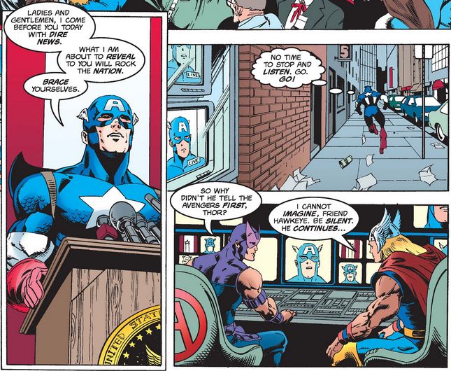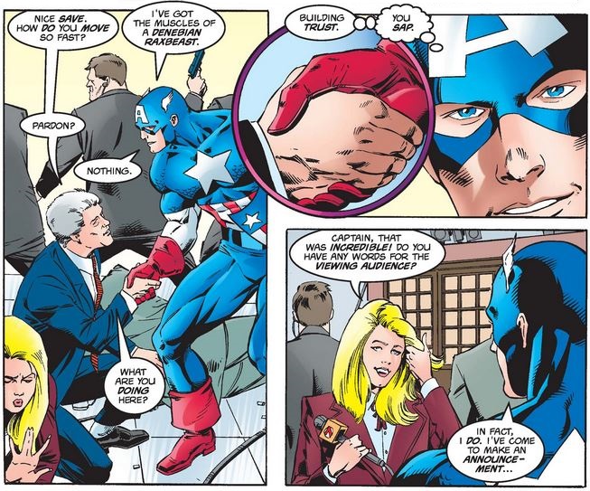 Meanwhile, Skrull-Cap is hard at work, “saving” President Bill Clinton from terrorists (who are also Skrulls) before preparing for an impromptu press conference…