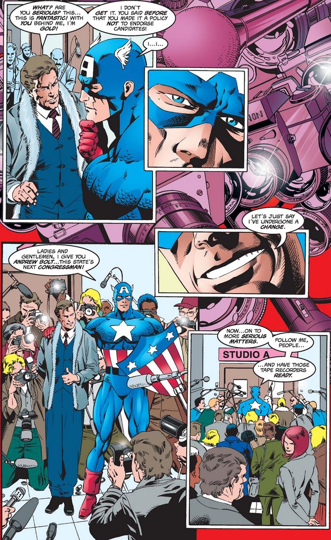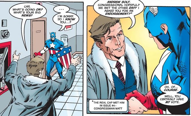 …but first he meets Andrew Bolt, the political candidate the real Cap met in issue #4 and refused to endorse for the sake of maintaining political neutrality.
