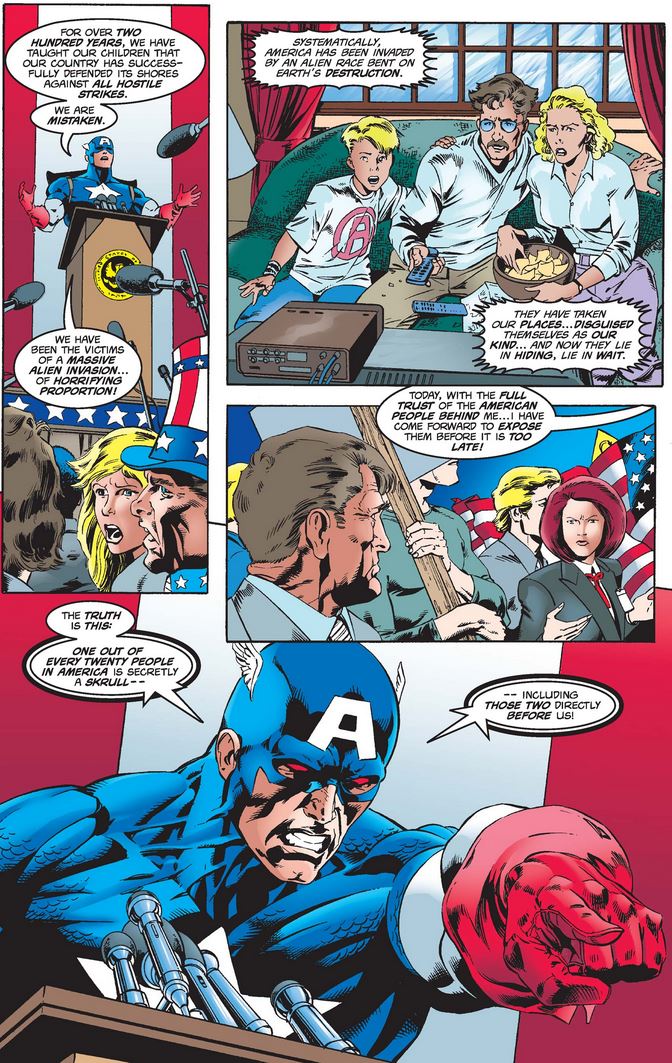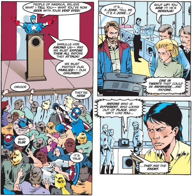 He expounds on this “threat,” asking Americans to look skeptically at each other and see if anyone is “different” or “looks out of place”—again, following the fascist strategy of dividing the people into “us” and “them,” those who “belong here” and those who “need to leave.” (The irony is that Skrulls wouldn’t look any different—that’s their whole point!)