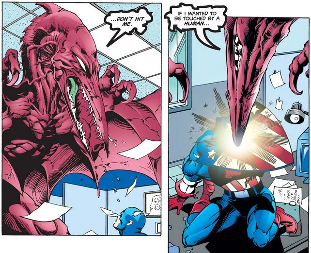 Skrull-Cap, of course, has no such qualms, and after he learns that the real Cap doesn’t make political endorsements, he decidedly goes a different way.