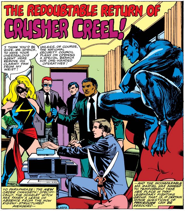 If you thought he’s a minor character, wait til you meet Jenkins, last seen in Avengers #183—which was also Carol’s first issue as an Avenger, which brings up an unfortunate interaction.