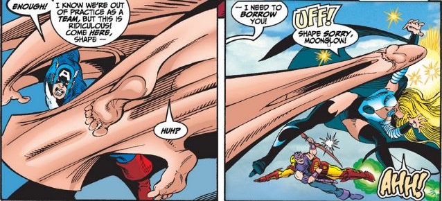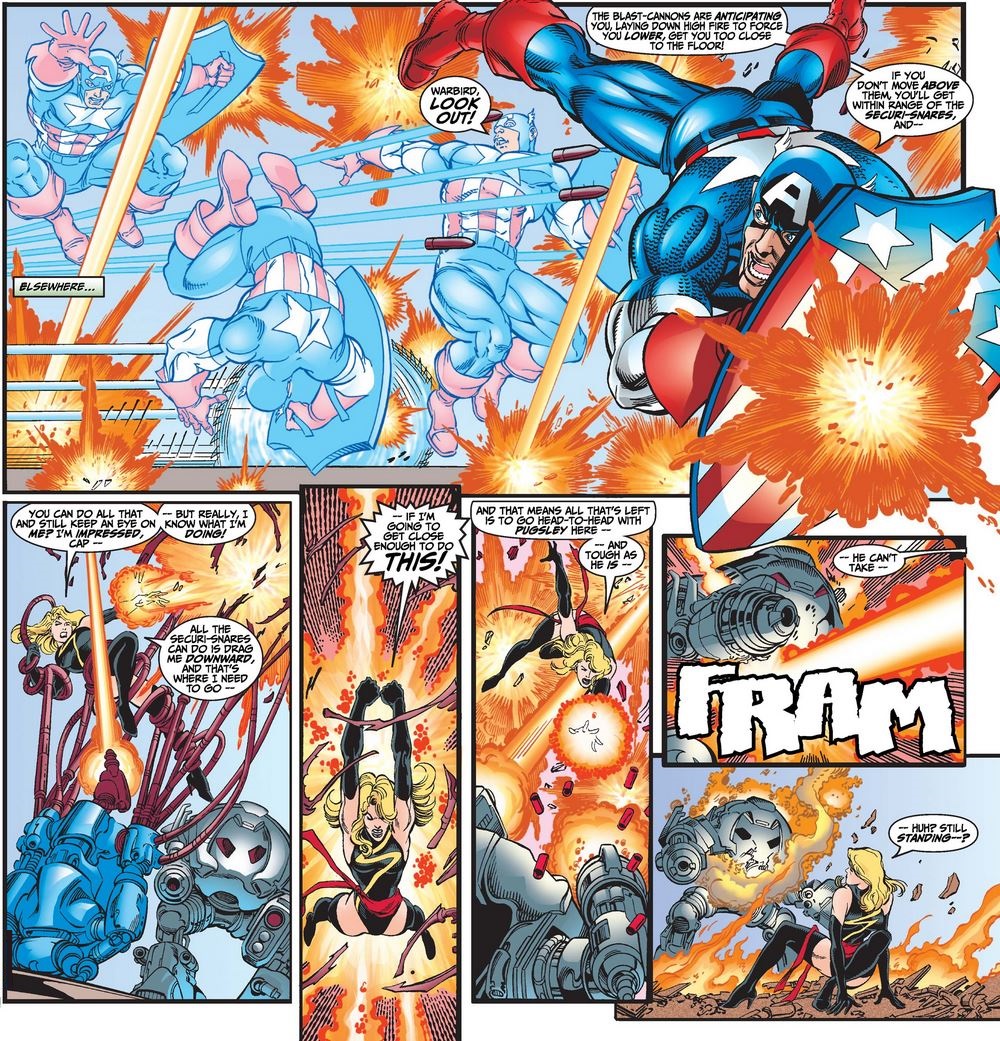 After looking into possible psychic villains who could be controlling the Squadron Supreme (as well as investigating their quarters), the Avengers are alerted to the return of the other team, who assume the Avengers are there to plant evidence and set them up (which is reasonable under the circumstances). They begin to fight, and while Cap struggles with his second-rate shield against Skylark (an analogue of both Black Canary and Hawkgirl), he notes Carol is a bit off…