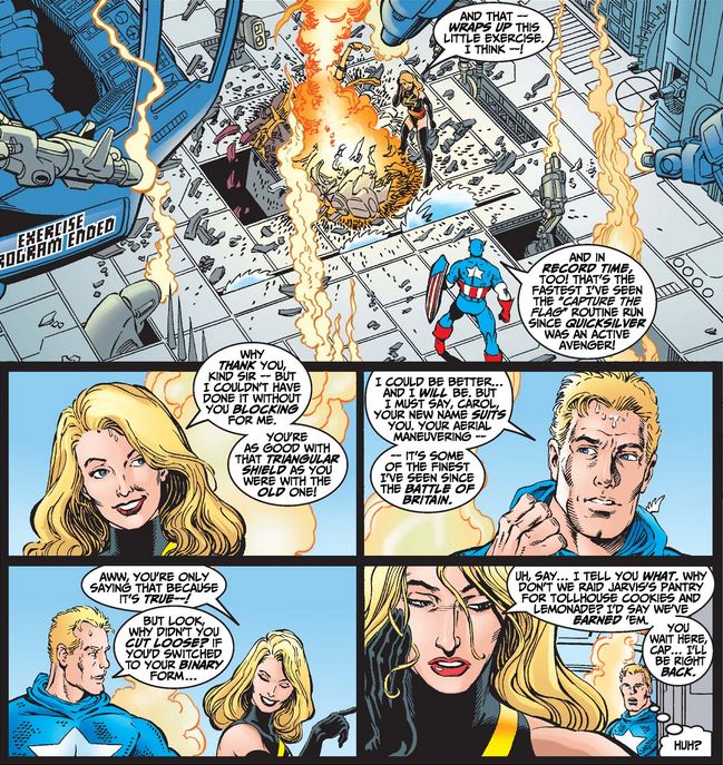 Cap has nothing but praise for Carol’s work—and nothing but deflection of her praise of his skill with his new shield—but is surprised when she just as expertly deflects his question about her Binary powers (which she recently lost, prompting the name change).