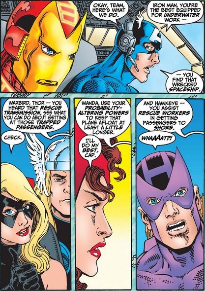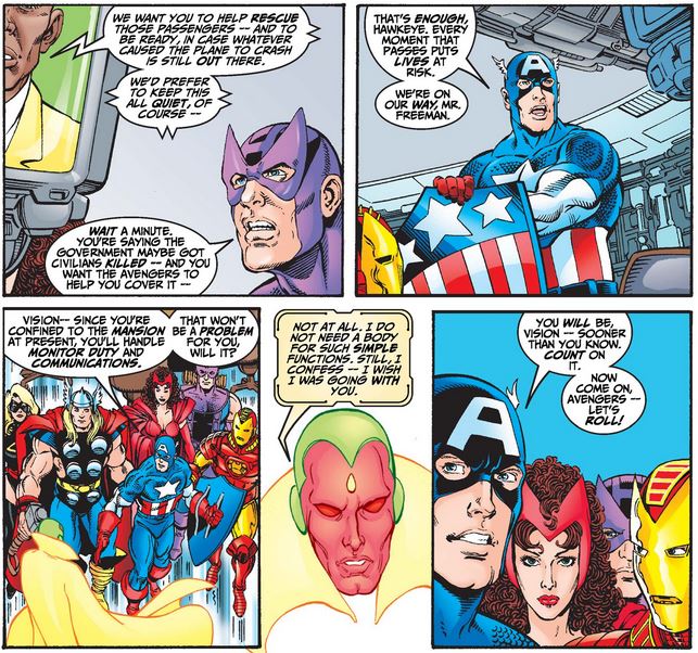 Soon Cap summons the team to an emergency meeting, at which their new government liaison, Duane Freeman, tells them about an alien spacecraft sunken off the coast of Maine and a commercial jetliner carrying a team from Project PEGASUS (introduced in Marvel Two-in-One #42) to investigate it, that mysteriously crashed nearby. There’s a hitch that Hawkeye understandably bristles at, but Cap is more focused on saving lives and launches into leader mode (and also manages to assure Vision that his body, destroyed in issue #3, will be up and running soon).