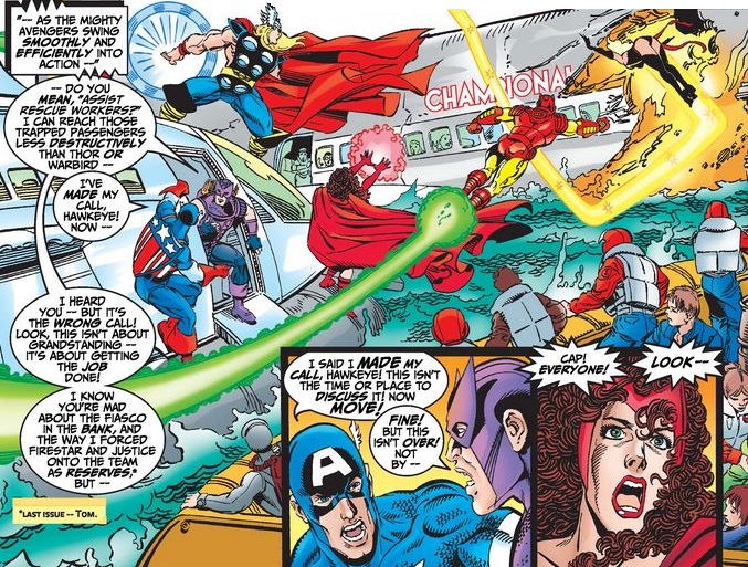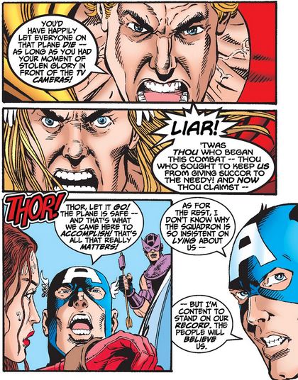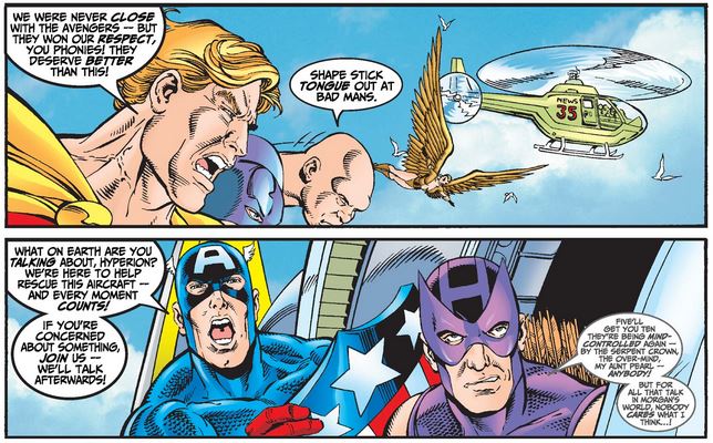 After Wanda summons Wonder Man again (as she first did in issue #2), the Avengers finally get the upper hand, leaving Thor and Hyperion to face off, first physically and then verbally, while Doctor Spectrum rescues the sinking plane. Cap is just relieved the passengers are safe, and trusts that the people will appreciate their efforts.