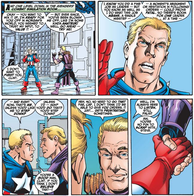 During their sidebar, Cap explains the need for singular leadership at times like these (and when are they not in “times like these”?). He offers to hand the reins over to Clint, assuring his friend that he believes in him while also serving to call his bluff (and ruining his fun).
