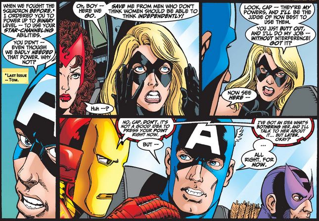 Cap directly confronts Carol about her refusal to use her Binary powers, and after she gets defensive—and abuses a feminist argument that is often valid in other circumstances—sage Tony recommends patience, which Cap accepts.